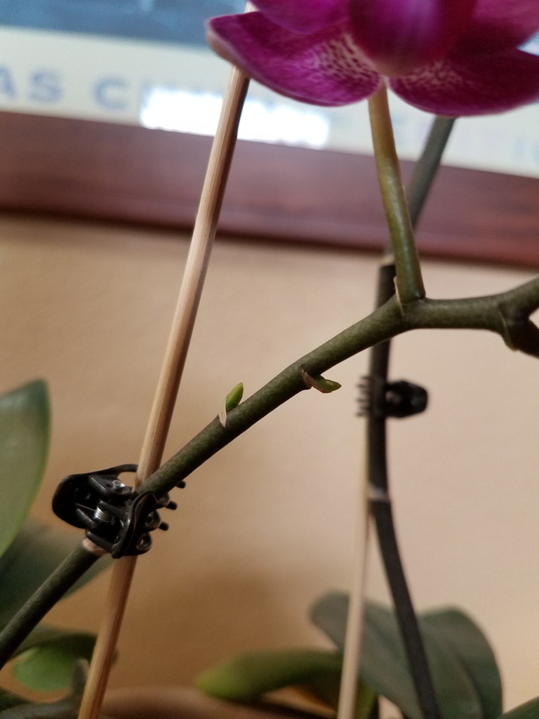 Do you see the new growth emerging on the stem that holds the blooms of this orchid? Yay! I think that we are looking at the beginning of new stew offshoots that will produce more blooms. This plant is an overachiever!! Yay orchid!
