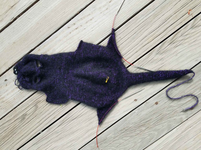 As a little break I started knitting the Maya cat. The black mohair yarns will continue to cover up the purple as the halo develops. Right now I’m pretty happy with how it looks.