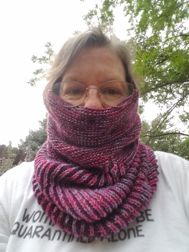 .Not only does this cowl go perfectly with my new V-Neck Boxy sweater, but it matches both of my winter coats. I’m going to get a lot of mileage out of this cowl!! The only other knitting was this: I got so cold this week that I cast on some new armwarmers that I am kind of inventing as I go along. Next week I’ll show them off.