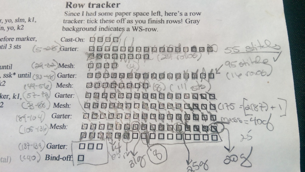 Look at what Noora gave us in the pattern! Wow, isn’t this a nice idea. In fact, it made me think that all patterns should be organized as a table with the rows, stitch count, the pattern, weight of the yarn and a place to make tally marks. I mean, why does the entire thing have to be written out? See how I started tracking how much my ball of yarn weighed every 4 rows? I decided to switch to the last 4 rows as soon as I had only 8 grams left. (8 rows of the mesh section were skipped)This is how many grams of yarn I had left over after binding off.