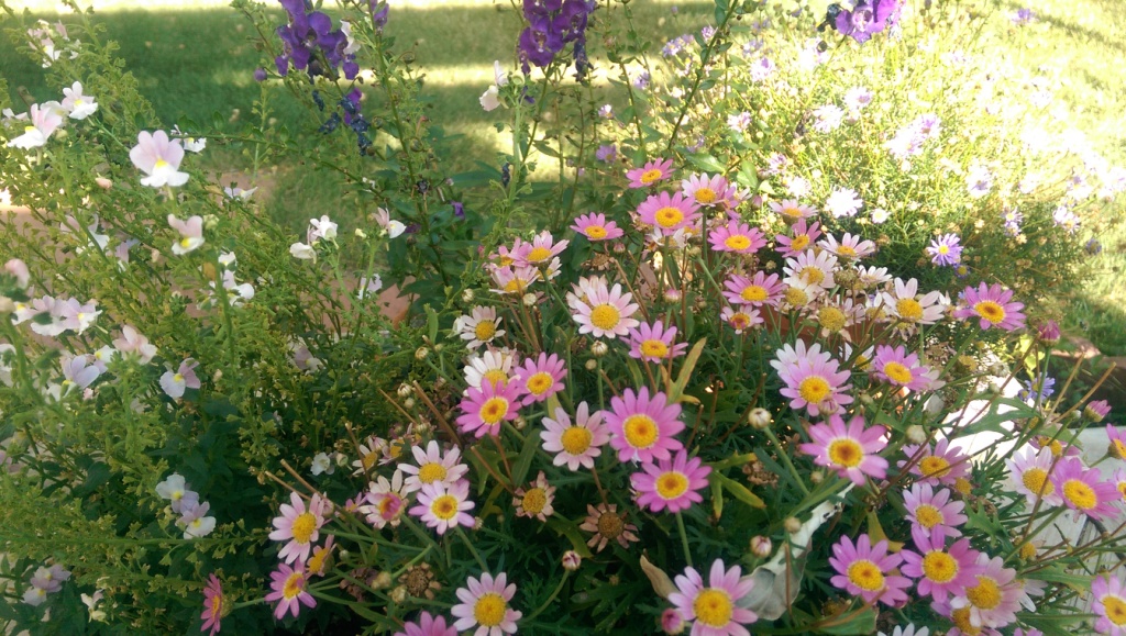 The weather was cool for several days before the thermostat went back up into the high 90’s. Many of the potted plants were able to recover over the last week, and things are looking pretty cheerful out front again.