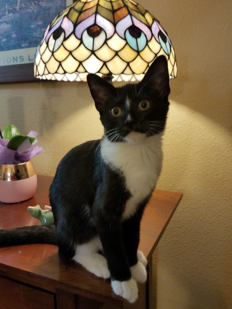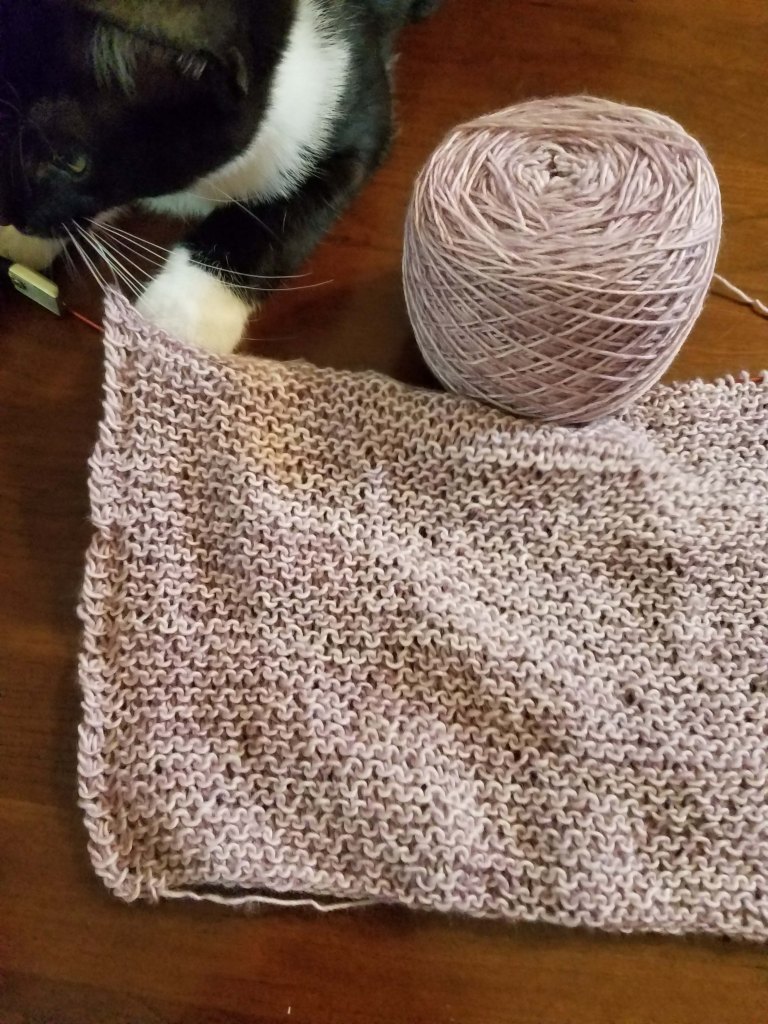 I’m back to reading science fiction. The main character in the book I’m reading right now is a sentient space ship called Trouble Dog and of course the captain of this ship is a woman facing down the monsters in the dark of space. I just finished the first book in the series called Embers of War and I’m hooked. Luckily I get the audiobook for no additional cost so I can listen to the books at times while I’m knitting away on the hats and PICC line covers. I have to laugh a little as I knit and listen to Trouble Dog’s tale as I manage my yarn around my own little Trouble Cat…