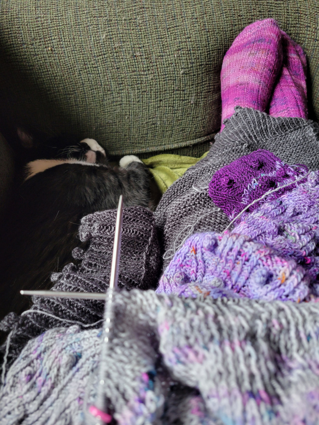 I was moved to new drugs. I started a third immunosuppressive drug, one that was off-label and required a fight with the insurance company, and I began to slowly improve. Palliative care discharged me. I found more beautiful yarns to love, and more shawls to knit. The shawls began to pile up along with the number of diagnosed complicating conditions that were linked to my underlying autoimmune diseases, but I was okay; I had essentially knitted (and blogged) my way through grief, and I was now ready to take things on. I found new doctors who became collaborative partners in my care and faced down the monsters of new complications. Today I am much, much better than expected; my latest lung testing shows that my lungs have regained more function, and my PAH is under control. My cardiologist rarely mentions heart failure when he talks to me, and I am off oxygen.