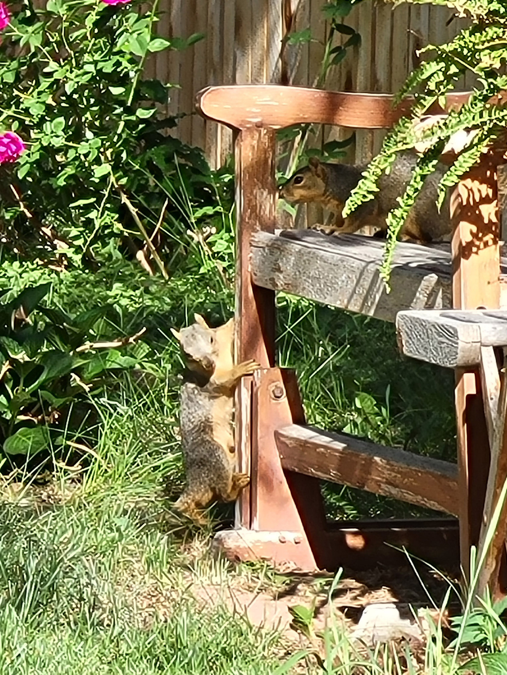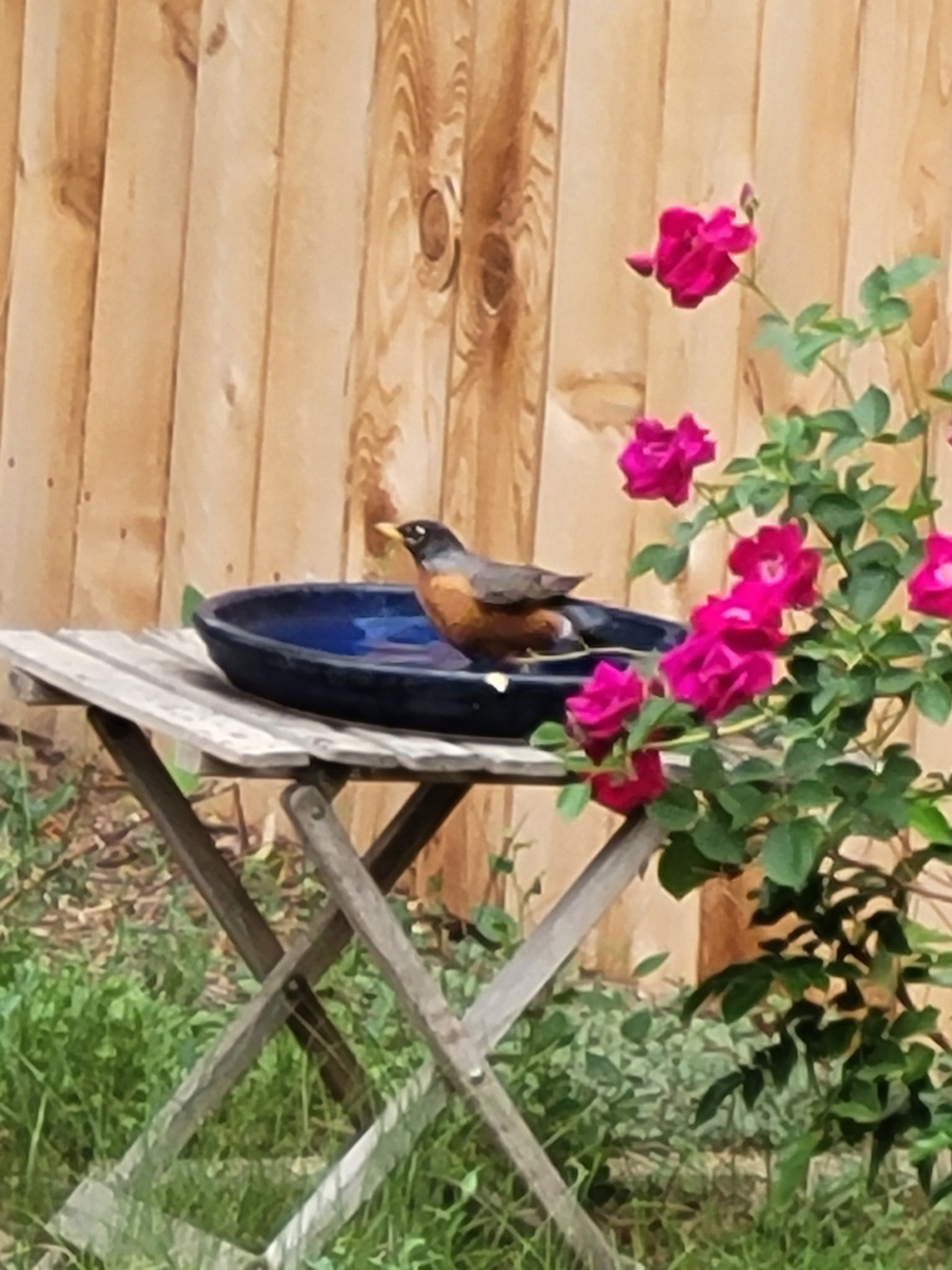 My yard is a playground for a group of juvenile squirrels who are always entertaining. There are huge swallowtail butterflies and tiny birds in the yard, but those guys haven’t stopped long enough for me to get a photo yet. The robin is a regular at my little birdbath, and the first bumblebees of the year showed up to sample some of my flowers. My favorite rose bush, the Princess Alexandra of Kent, now has 15 blooms going. My back gardens are filled with new plantings, and the lavender and yarrow are just a few days away from the first blooms. I’m really enjoying my time outside reading, and then I think about the book while I pull weeds and put the gardens into order.