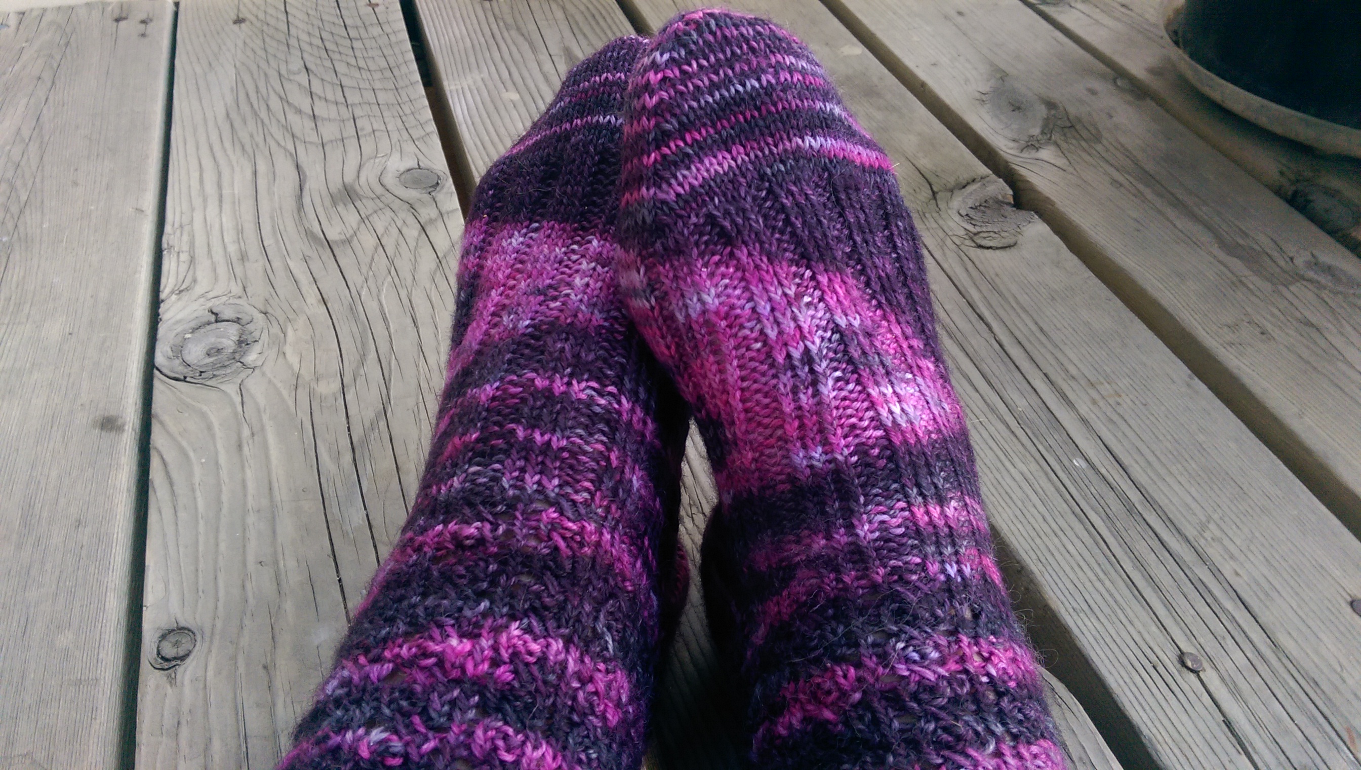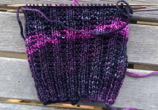 So when I saw this yarn at Shuttles, Spindles and Skeins in Boulder, Colorado, I had to have it. It was Corriedale sock yarn, dyed locally at MJ Yarns in a wonderful colorway called Midnight Orchid. I couldn’t wait to get started on it, and cast on to make simple garter rib socks to show off the fabulous colors.