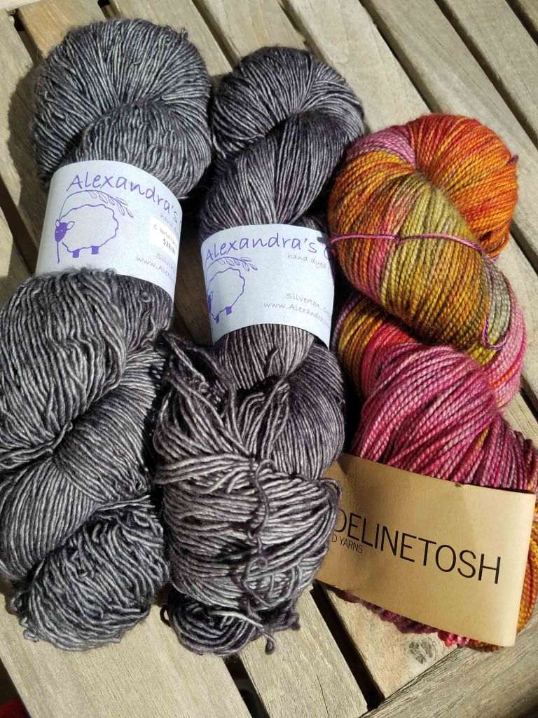 Well, let’s talk about Snark-O-Meter. I have been dreaming about colors and digging in the stash for weeks. I would decide on a combo, but then the next morning I would remember a different skein of yarn in the stash and the amended quartet of yarn would suddenly become my new favorite. I finally settled on a color combo that I know will go with almost everything that I wear.