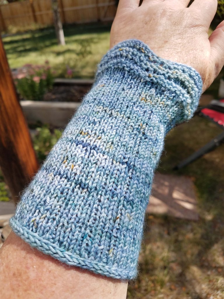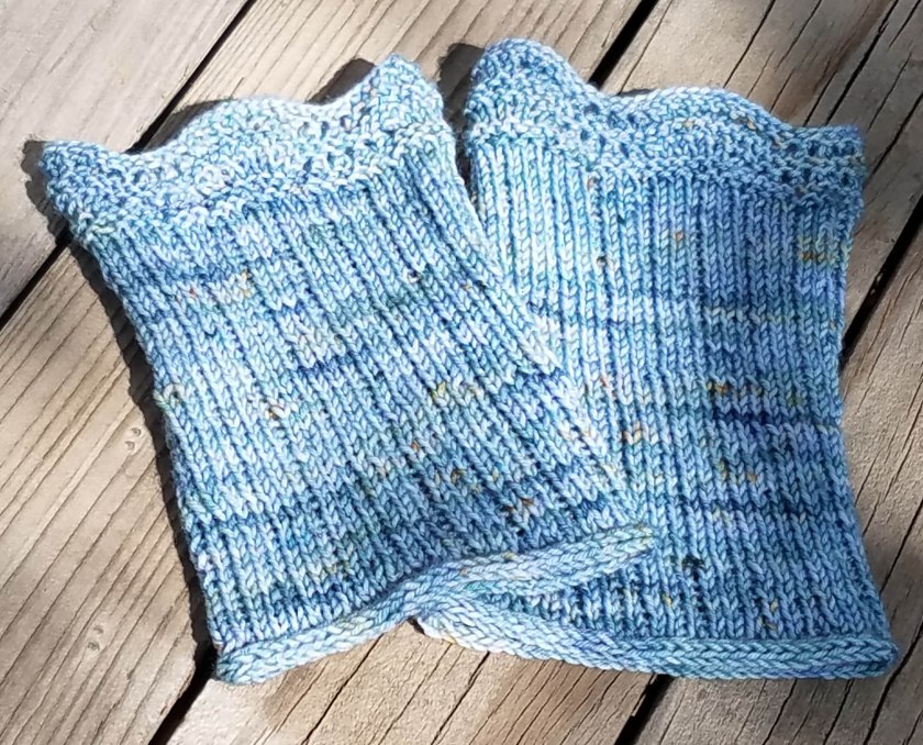 These wristers will work well this winter under sweaters and over long sleeved shirts in my usual struggle to keep my fingers warm, but I’m wearing them alone right now whenever I get exposed to air conditioning. Pleased with my sock pattern inventiveness I cast on another sock last night…