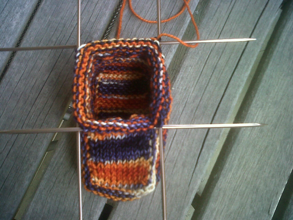 Wow. This week I was definitely stuck in the baby bootie knitting rut. I went ahead and made two more pairs for friends of my original customer; kind of a ripple out effect. While I was making them I realized that while the pattern is pretty simple and straight forward, it is hard to visualize what is happening. So here is the pattern, exactly the way that it was taught to me, with picture support. The booties in the picture are being made on 2.25mm double pointed needles with Broncos Football colored fingering yarn that I bought at my local yarn store. In case you haven’t guessed, this is Broncos Country since I live in Colorado.