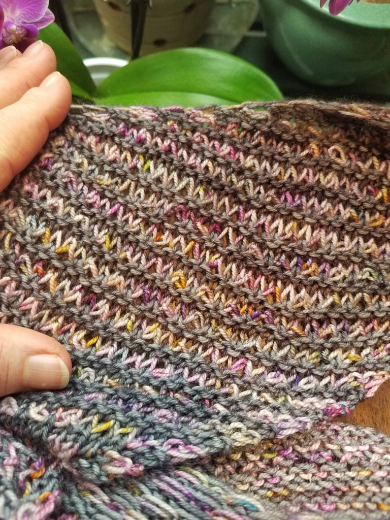This shawl is made of yarns that I have loved and hoarded for years. Really, I have held onto a couple of these skeins for a decade because the exact right project never came around… when I love a yarn it has to go to a project worthy of it, right?! The pink yarn was bought several years ago on a trip to the Estes Park Wool Market in Estes Park, Colorado. Every time I look at it I smile thinking about the sheep and alpaca I saw that day, not to mention lamb barbeque, cinnamon pecans, and a fabulous day in the mountains! The gold yarn is a silk/yak/merino blend that I bought at a pop-up shop set up in a Boulder, Colorado yarn store that is now closed. I learned to spin and weave in that shop (Shuttles, Spindles & Skeins) and this special yarn is forever linked to that store. Also, I just love the glow of this gold yarn!! The purple I bought in a shop in Arvada, Colorado while visiting yarn stores along the front range of the Rockies as I participated in Yarn Along the Rockies, an annual shop hop in my area of the state of Colorado. How much fun a shop hop is… you pile into cars with your friends, throw caution to the winds as you use Google Maps to navigate through shadowed mountain roads and strange towns to discover a new gem of a yarn store. Inevitably you end up at a great lunch location to swap stories and shopping scores with your friends before heading out again on the hop. Good times!! Needing a yarn to pull these three together I bought two skeins online at Hue Loco (Loveland, Colorado) earlier this year. This shawl is something of a celebration of my well fed and nourished yarn stash as it also showcases the Colorado fiber artists whose work it incorporates. How ironic, at the end of this year that I have spent isolating alone with my pandemic kitten, I have completed this knitted piece of wearable art made from the yarns of my state, acquired as I traveled around it in happier days before I was diagnosed with my autoimmune diseases and Covid-19 appeared in our world. Soft and warm, heavy with happy memories, I am armored against the world outside.