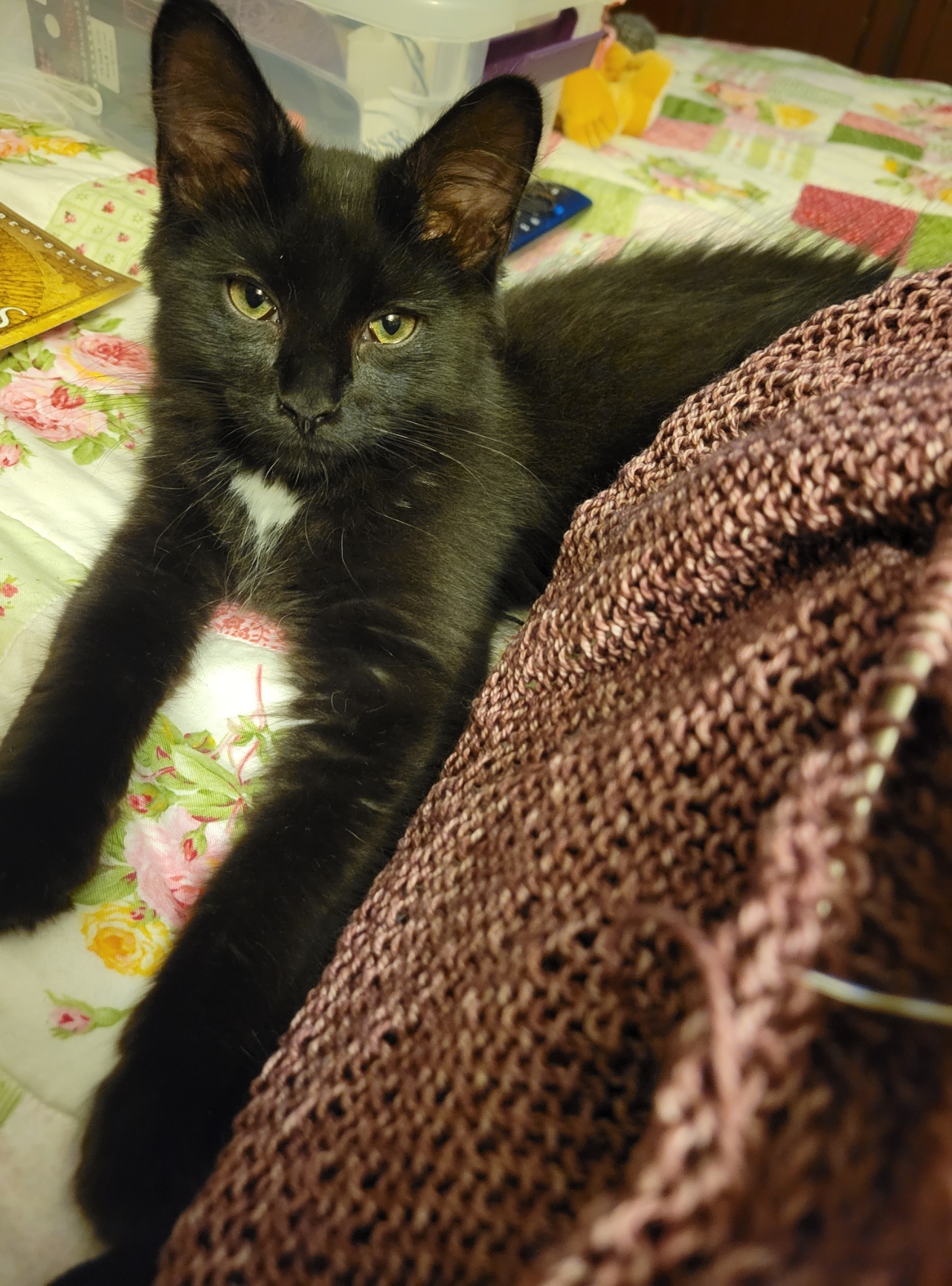 So that has pretty much been the last two weeks. Sleeping, knitting, and listening to really interesting books. I like the yarn and the books, but I do hope that the Mother of Cats will stop being so lazy… Mateo and I have needs, right?