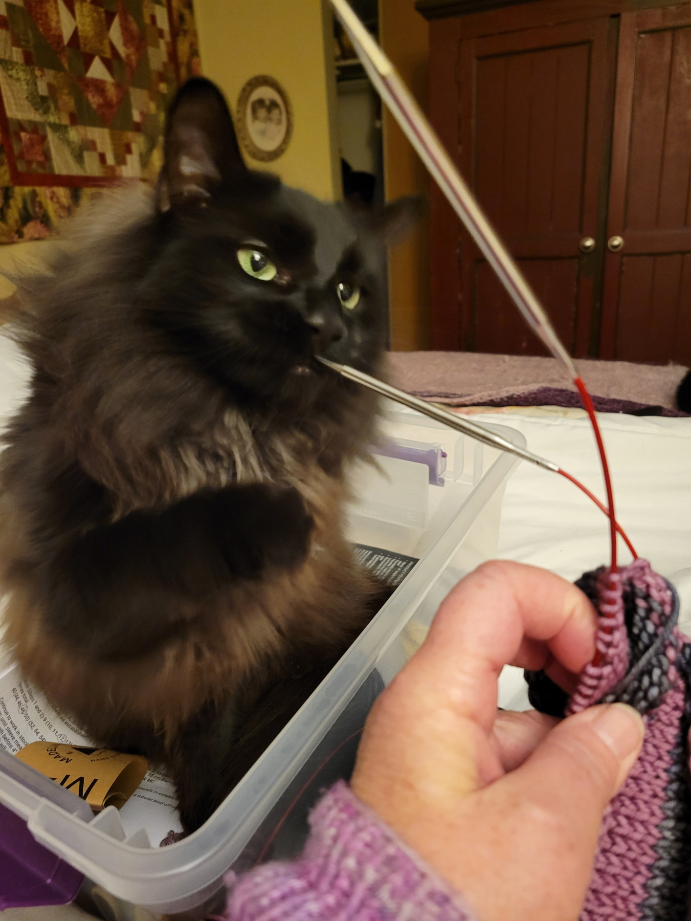 The Mother of Cats has been listening to an audiobook during some of her knitting, so I get to listen along with her while she knits and I help with the yarn management.