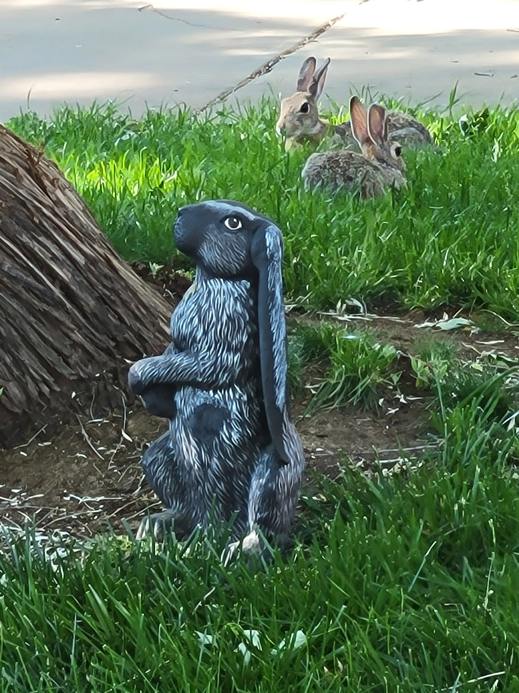 The left is a bunny on the highway past my deck, and the little statue under the tree with the frolicking bunnies is in my new neighbor’s yard.