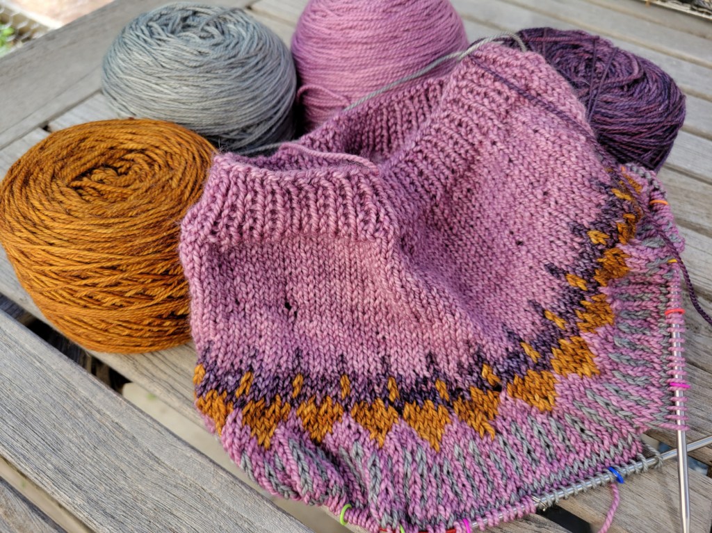 I have to admit, I’ve been way too emotionally involved in this little sweater, the Soldotna Crop by Caitlin Hunter. I shopped and shopped the stash for some yarn. I dithered about whether to knit this little charmer in the DK weight that the pattern was written for, or to go rogue and to try it out in fingering weight. Needle size became an issue. I decided to go up a pattern size, because… fingering… even though my gauge was close. Then there were the colors… I was pretty torn about how to handle the four colors as they are displayed in the final sweater. I wanted a speckled or variegated yarn to break up the pattern a little, but that creates its own issues… Finally, finally I arrived at a final decision and got through more than half of the colorwork chart. Here’s the post about all the false starts, tinking and whatnot that went on…