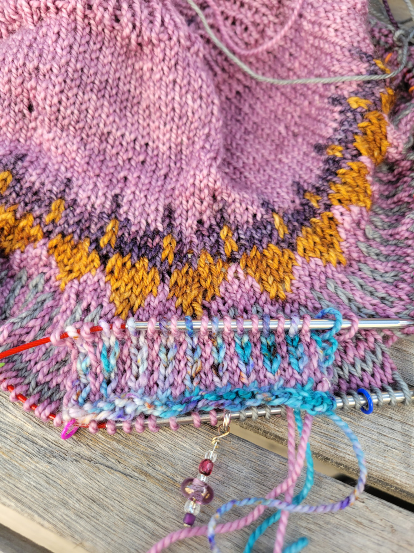 Yeah. I didn’t like the way the third color, the turquoise multi, looked. I wanted the gold next to the dark plum. I tinked back and dug around in the yarn stash.