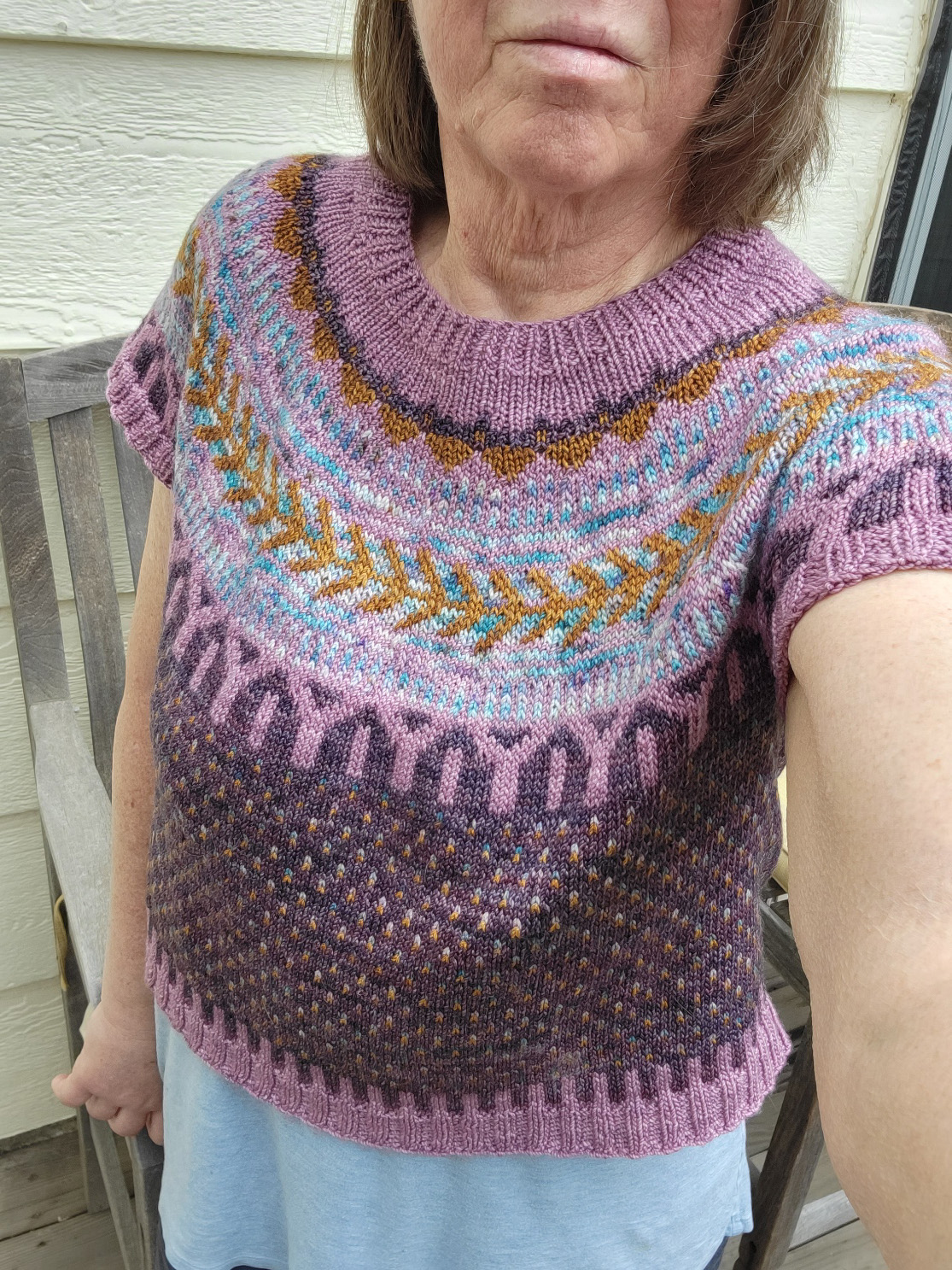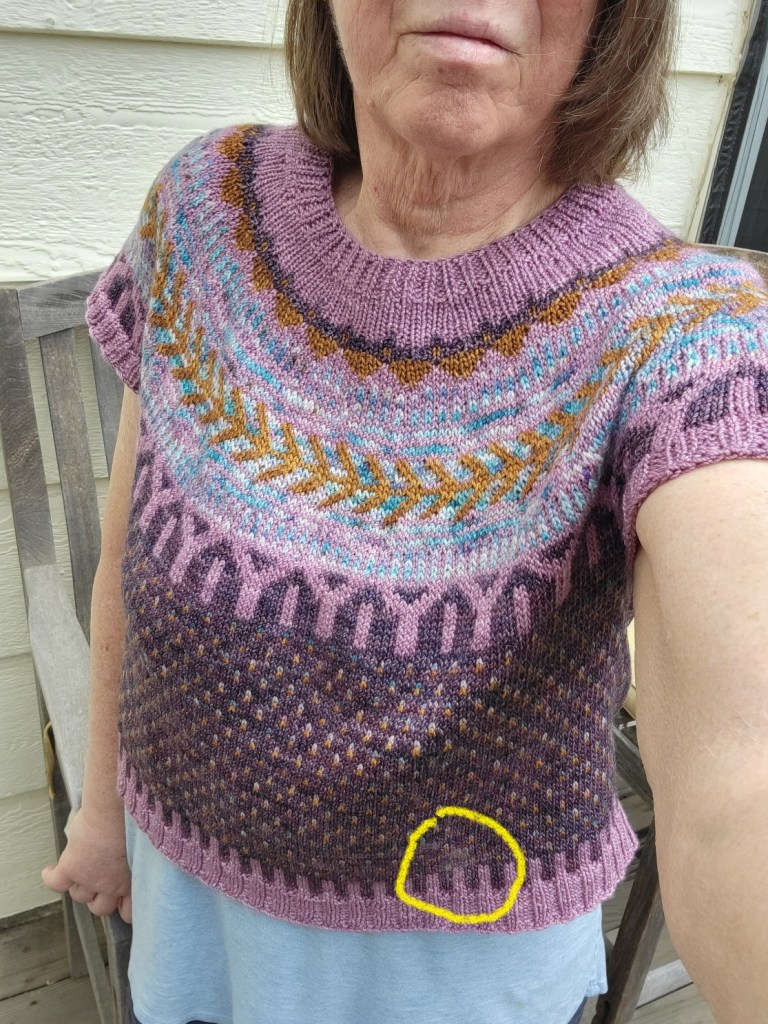 I think that I’m done tinking for now; the plan is to just keep knitting and let the color chips fall where they may. My hands are feeling so much better that I can knit pain-free again, but I am still wearing the compression wrist braces for now. I’m almost halfway through the color chart and my gauge is spot on. I’m feeling pretty good about the knitting and there is only one last concern hanging over me… I sure hope that this thing fits!!