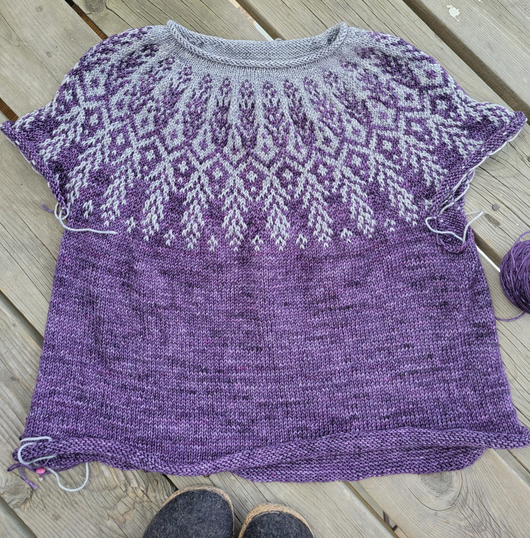 The yarn picture on the left is the original kit. The one on the right is the new variation that I’m not completely happy with. Feeling hopeful and more than a little determined, I sat on the floor in front of the most likely candidate yarns and, rocking my new O2 concentrator, holding up my phone with the yarns on the screen, I kept looking at different ideas for the fade…