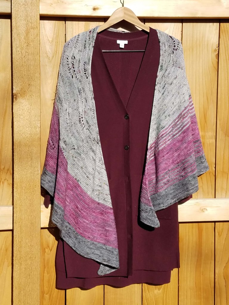 This shawl is made of yarns that I have loved and hoarded for years. Really, I have held onto a couple of these skeins for a decade because the exact right project never came around… when I love a yarn it has to go to a project worthy of it, right?! The pink yarn was bought several years ago on a trip to the Estes Park Wool Market in Estes Park, Colorado. Every time I look at it I smile thinking about the sheep and alpaca I saw that day, not to mention lamb barbeque, cinnamon pecans, and a fabulous day in the mountains! The gold yarn is a silk/yak/merino blend that I bought at a pop-up shop set up in a Boulder, Colorado yarn store that is now closed. I learned to spin and weave in that shop (Shuttles, Spindles & Skeins) and this special yarn is forever linked to that store. Also, I just love the glow of this gold yarn!! The purple I bought in a shop in Arvada, Colorado while visiting yarn stores along the front range of the Rockies as I participated in Yarn Along the Rockies, an annual shop hop in my area of the state of Colorado. How much fun a shop hop is… you pile into cars with your friends, throw caution to the winds as you use Google Maps to navigate through shadowed mountain roads and strange towns to discover a new gem of a yarn store. Inevitably you end up at a great lunch location to swap stories and shopping scores with your friends before heading out again on the hop. Good times!! Needing a yarn to pull these three together I bought two skeins online at Hue Loco (Loveland, Colorado) earlier this year. This shawl is something of a celebration of my well fed and nourished yarn stash as it also showcases the Colorado fiber artists whose work it incorporates. How ironic, at the end of this year that I have spent isolating alone with my pandemic kitten, I have completed this knitted piece of wearable art made from the yarns of my state, acquired as I traveled around it in happier days before I was diagnosed with my autoimmune diseases and Covid-19 appeared in our world. Soft and warm, heavy with happy memories, I am armored against the world outside.