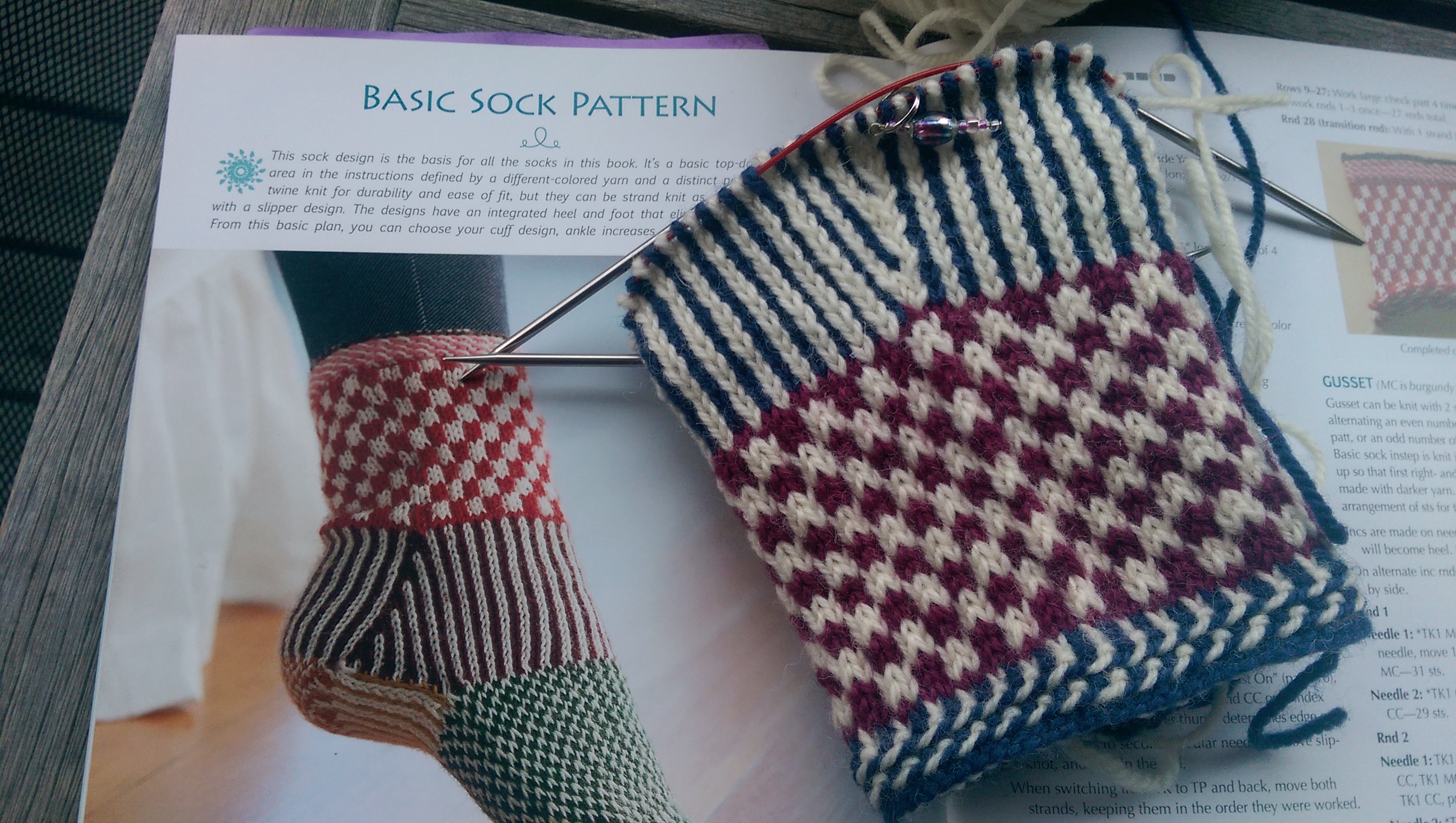 Once I had the pattern again, I did some counting of stitches and used the chart to figure out where I was in the knitting. Oh my goodness, I was up at the neckline and there are 4 different steeks in this knitted wonder!! The front steek is now on standby, and I just have to worry about the sleeves and the one created to handle the neckline. The notes on the chart I was using actually are the count of the neckline decreases and I had the armhole steeks drawn onto the chart. I’m so glad that I still have the chart and the yarn key! Evidently this was size medium… the directions even began to make sense as I read them over a couple of times. I pulled myself together and knit a few rounds and it all came back to me fairly quickly; I was able to start adding tally marks to the chart to track the neckline decreases just as I had more than two decades ago.