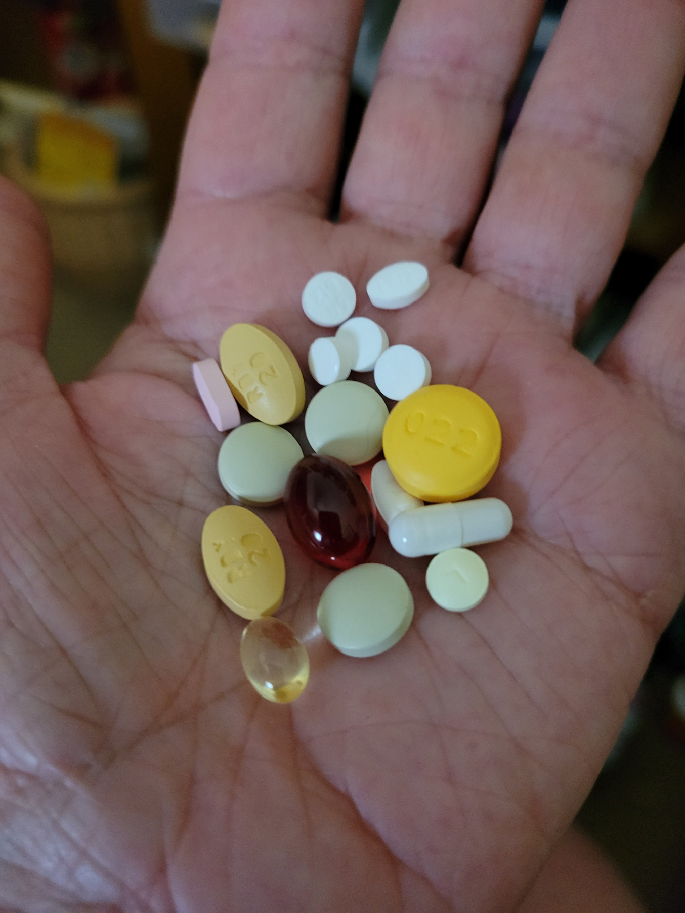 This is hitting me hard this evening because I have been dealing with autoimmune pneumonia since last December. My doctors are trying to get it under control with high dose immunosuppressants, but I am coming off one of them right now and I am struggling with shortness of breath and chest pain once again. I’m back on daytime oxygen and I’m feeling a little low. The lung biopsy was the first engagement with my interstitial lung disease, this current drug strategy the second battle, and the third battle is looming on the horizon. This isn’t a disease; it is a war. I never asked for this, and yet, here I am trapped in this unforeseen circumstance, engaged with an uncurable foe. Without the drugs in my hand above, I would already be gone. Yay, science!!