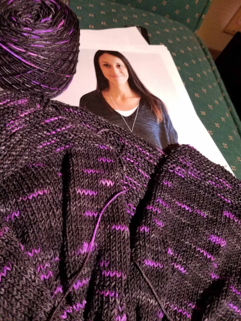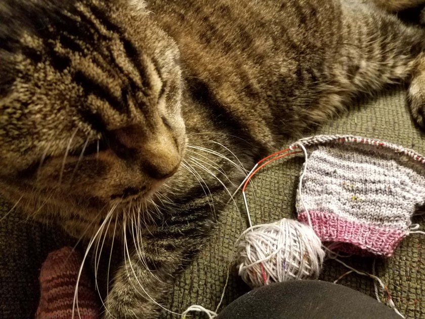 I helped her with all of the yarns while she worked, and really kept an eye on her work. She did take the yarn off of the needles and ripped back last night… Wow! So much yarn! She let me take care of it for her while she knitted it back in. Sometimes the Mother of Cats can be kind of fun.