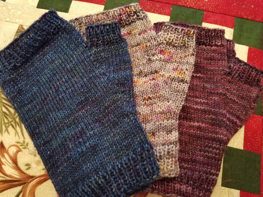 - When the cold weather arrived a few weeks ago I became consumed with the the need for more fingerless mitts and arm warmers/wristers. I dug around in the yarn stash to find leftovers from socks, and there were so many cute yarns that I just began mass producing mitt after mitt. They are the perfect carry-along in the car and I am finding them easy to do while listening to audiobooks in the evenings. I’m having fun, and if I need a quick gift in the future I am all set!!