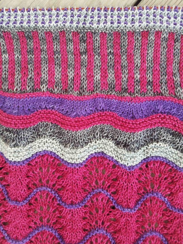In the background, being knit in chunks when new clues arrive, is my The Sharon Show shawl. If you don’t want to see this, I’m sorry. It really is too good to not show off. It is finally long enough to drape around my shoulders like a shawl which gives you an idea of all the colors and textures going on while this is being knitted.