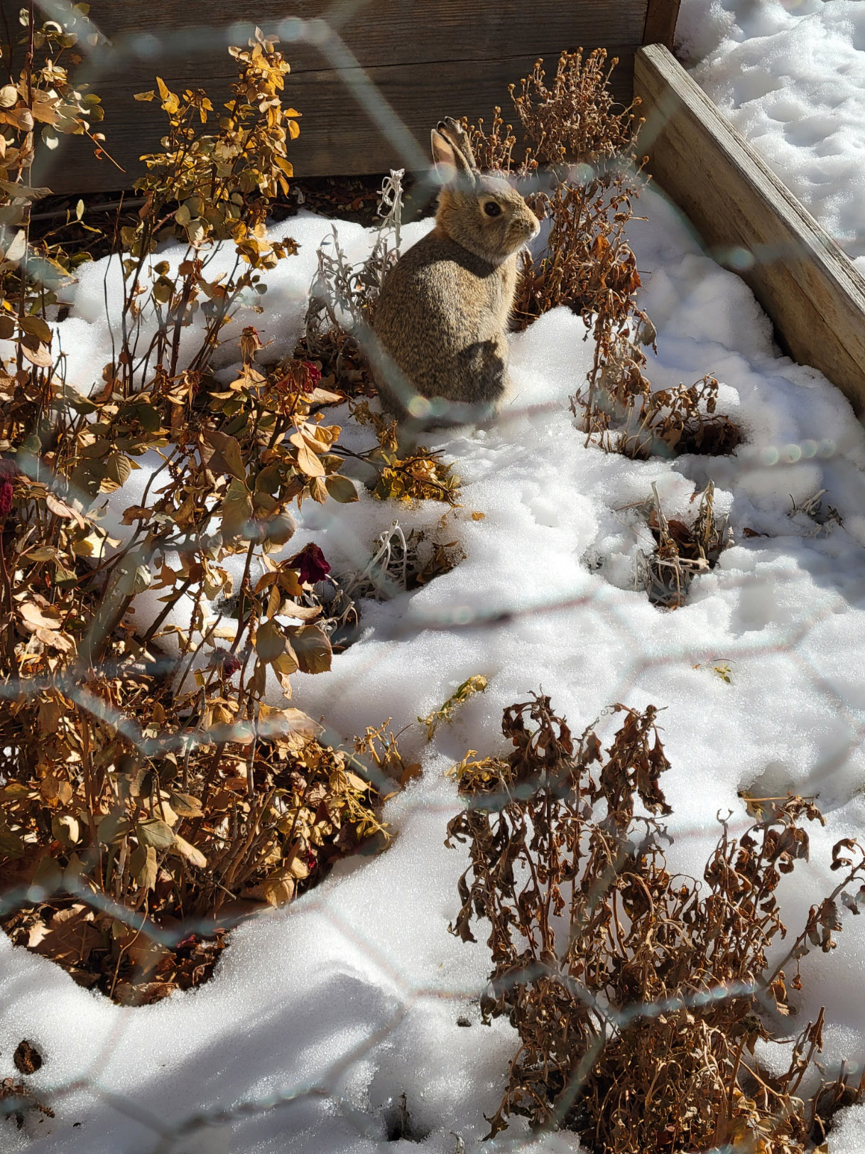 The backyard bunny was out in the garden! I mean, the bunny was RIGHT THERE at the side of the catio where the Orange Monster and I hang out in the mornings. The Mother of Cats has been feeding the bunny acorn squash (I know, right?! Why would she do something like that… but the bunny does eat it… thank heavens she isn’t giving it our TUNA!)