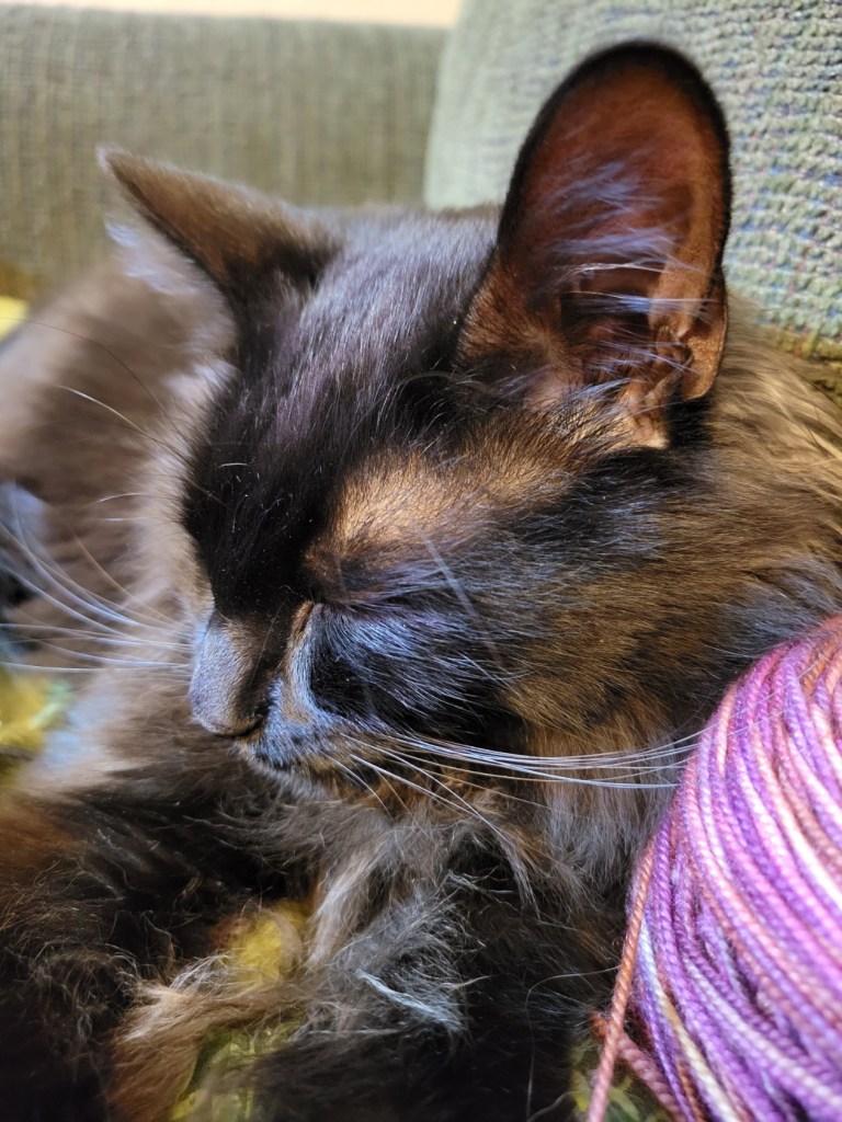 The top-down sweaters of 2022: these are Goldenfern, Emma, Salty Air Tee, Lace & Fade Boxy, Kevat, and Cushman. There was a lot of grey knitting going on last year so I’ve started out knitting a Simple Thing scarf thingy to wear with the neutral sweaters to give some color. I plan to make some wristers too, and I want to say that I am getting absolutely excellent knitting support from the CoalBear while I’m doing this.