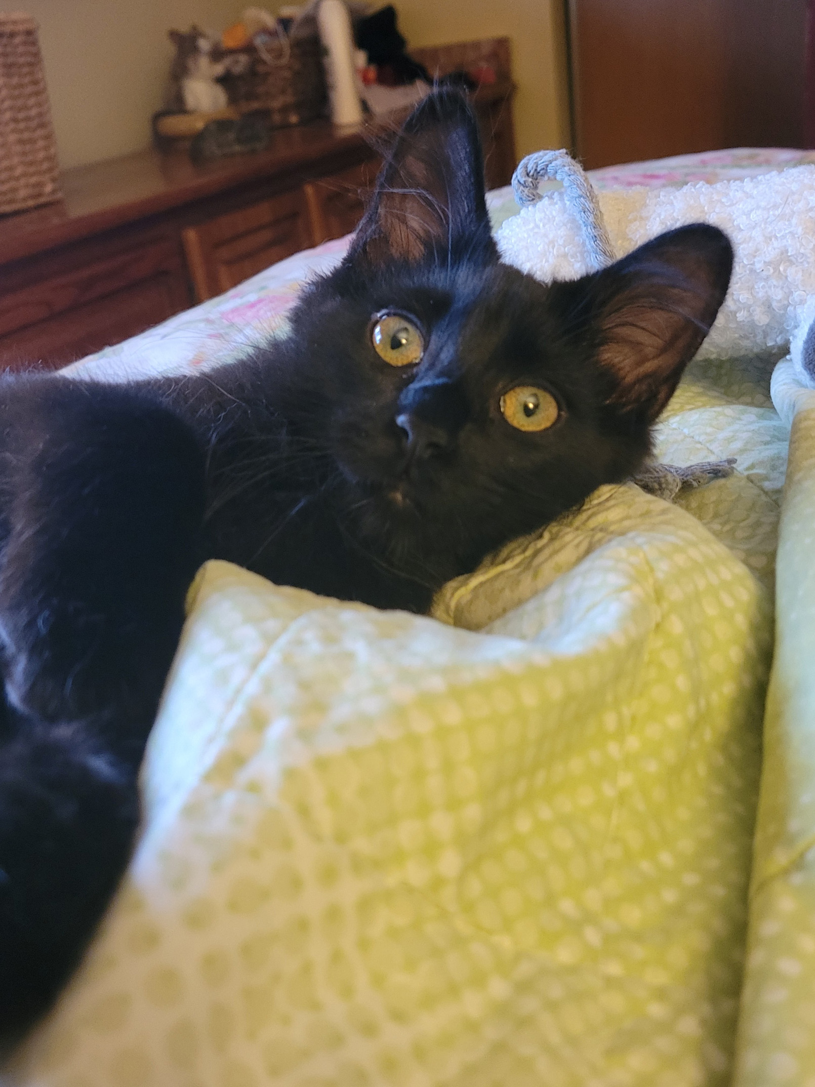 The new kitten, Mateo, continues to grow at an accelerated rate and is eating like a bottomless pit. He is now 3 months, 3 weeks old and is much less clumsy but still unable to jump up onto counters. Whew. No rush there. By the way, do those front paws look kind of big to you?